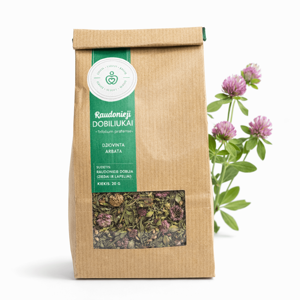 Sudėtis: 100 % džiovinti raudonųjų dobilų žiedai (Trifolium pratense).